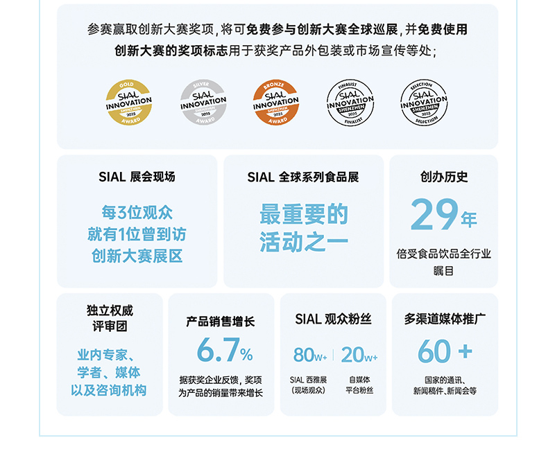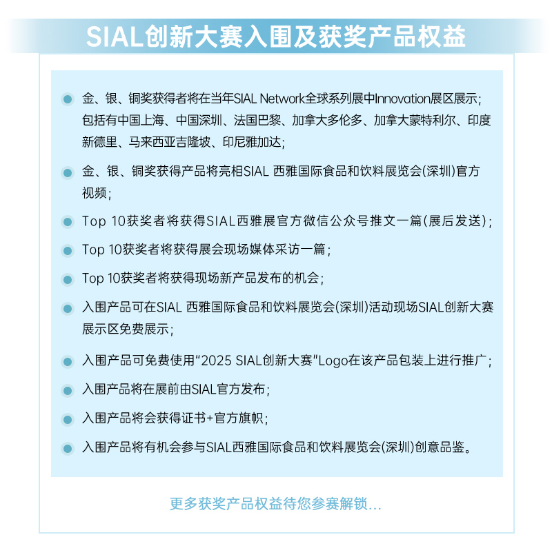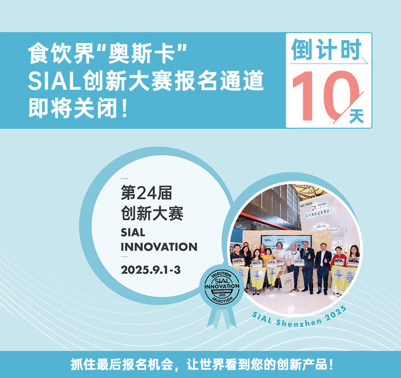 “SIAL Innovation創新大賽” 參賽報名線上通道開放僅剩最后10天!該比賽面向所有2025 SIAL西雅展(深圳)展商!若您還未報名,即刻登錄SIAL官網,點擊“展商會員中心-創新大賽”免費報名參與賽事。報名截止日期2025年8月10日。 |