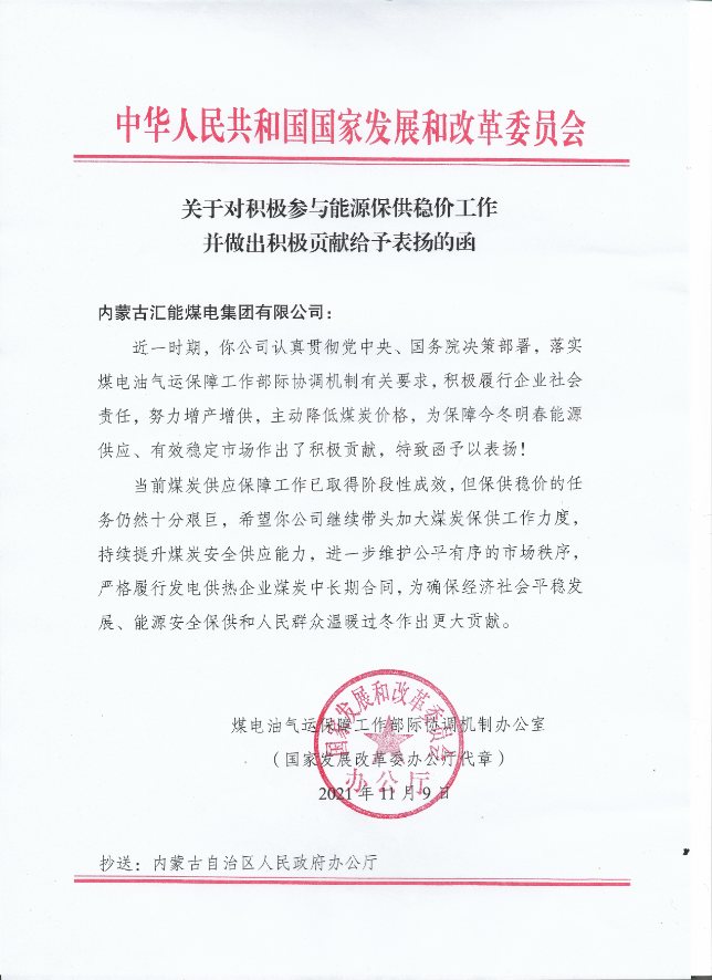 國家發改委關于對積極參與能源保供穩價工作并做出積極貢獻給予表揚的函